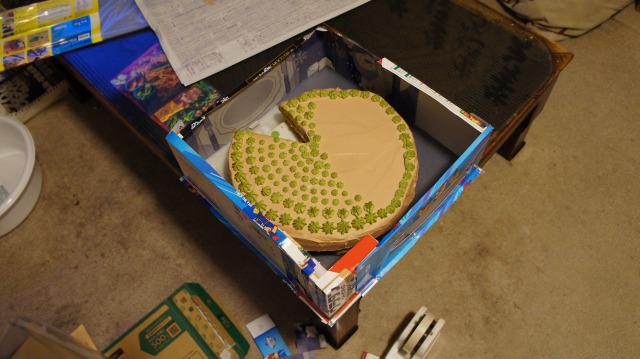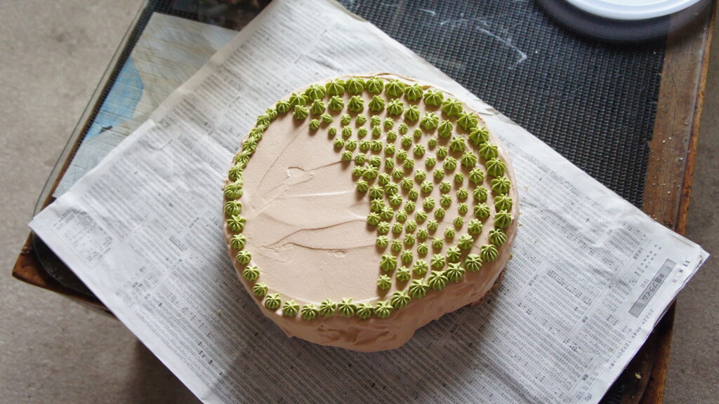 そもそも 、直径30センチの スポンジに クリーム塗ったものを 接触しないで カバーするとなると 、一辺が 33㎝くらいとなり 、ケーキの 箱としては 、かなりデカい 。