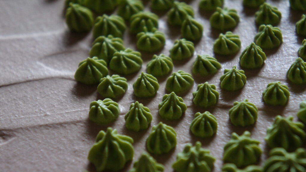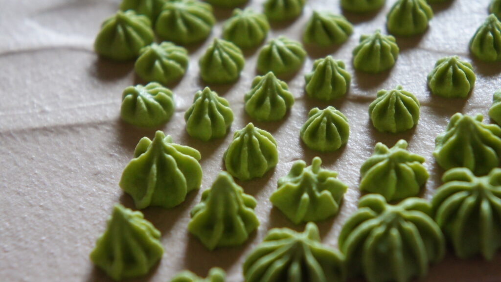 抹茶クリーム ( 純生クリーム ( 乳脂肪分44%クリーム と 抹茶 ) 。