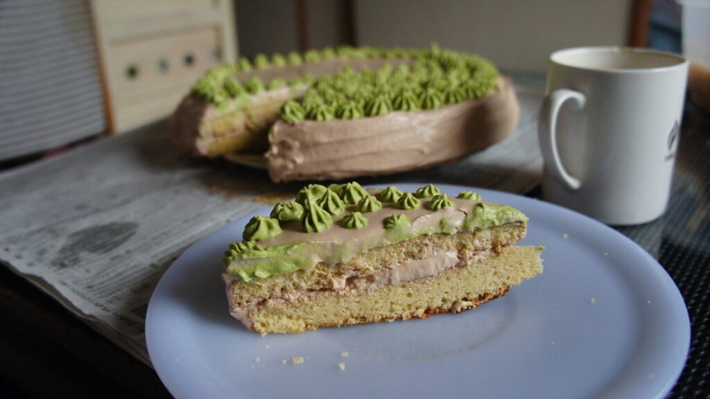 口の中で スポンジと クリームが 混ざった時 、ちょうどいい 美味しさになる 割合が あるな ・・・ と 感じる 。